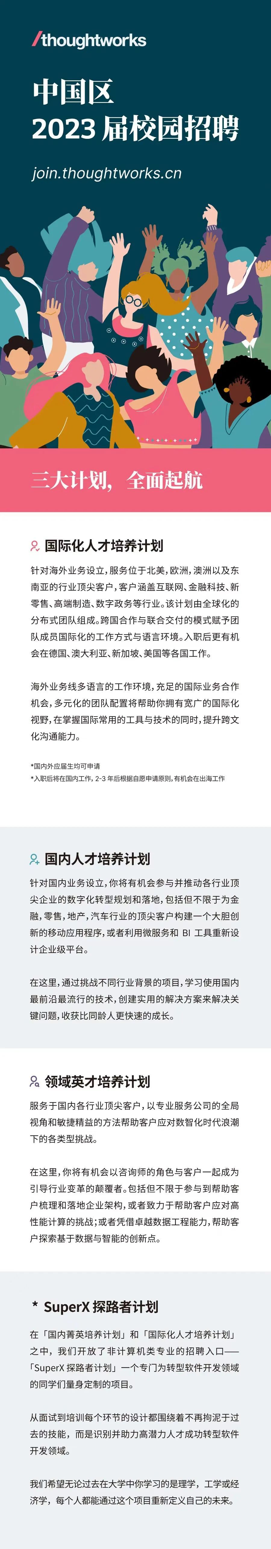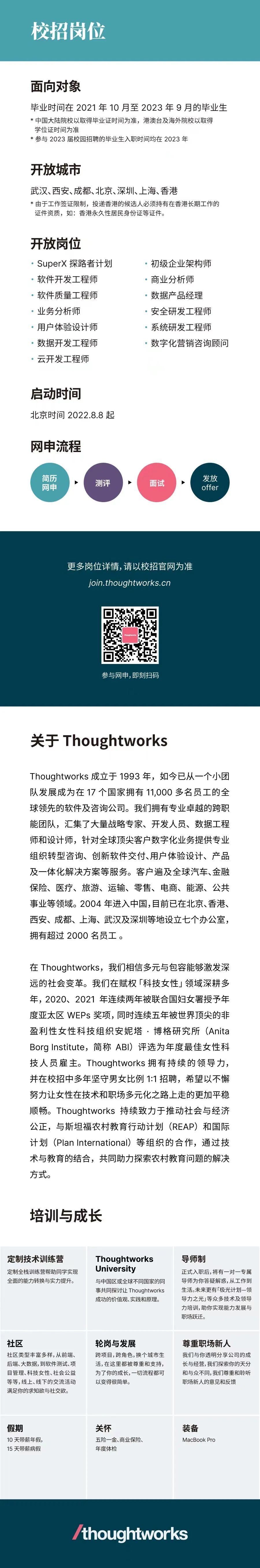 【招聘】Thoughtworks 中国区2023届校园招聘火热进行中! 最后更新于 Nov 1, 2022 叮!叮!海归学子们看这里!Thoughtworks2023届秋季校园招聘线上校友座谈会澳洲&新加坡&香港专场将于北京时间8月19日下午2点正式启动啦!关注本次线上校友会,从学长/学姐的讲述中走进Thoughworks,还有“出海计划”独家大揭秘哦~精彩多多,敬请关注!网申已于8月8日正式启动,有意向的同学们请点击文末”阅读原文“前往 Thoughtworks 中国区校招官网投递哦~更多秋招相关信息请移步长图文查看。扫描下方二维码,关注卡鲁学联官方公众号,获取更多资讯~
